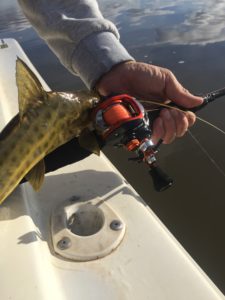 El Fish Hawk es un reel de perfil bajo o “galletita”, muy liviano, ágil y con una manija de fuerza que facilita hacer este tipo de pesca pesada con mejor esfuerzo.
